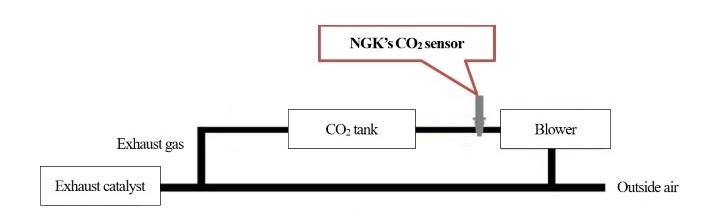 NGK’s CO2 sensor leverages ceramic technologies cultivated for onboard NOx sensors. It has a distinctive ability to detect CO2 concentration in exhaust gas in real time under high temperature and high humidity, allowing accurate monitoring of the system operation status. This enables a quantitative assessment of the atmospheric CO2 reduction effect according to distance travelled, increasing the reliability of the demonstration experiment.